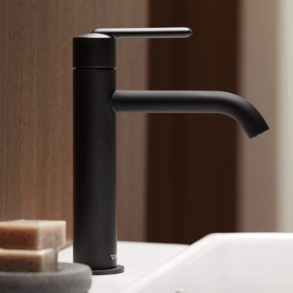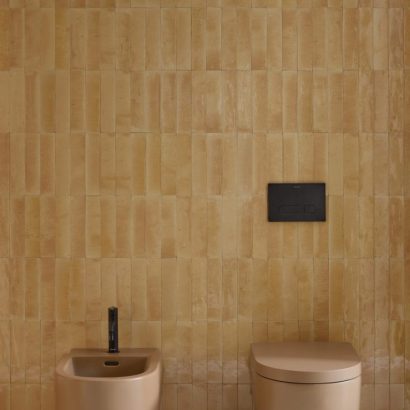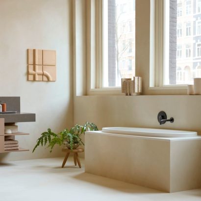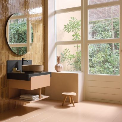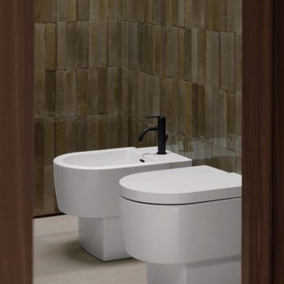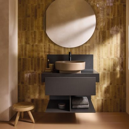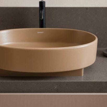 De opzetwastafels fungeren als sculpturale blikvangers en gaan verder dan alleen hun functionele rol. Urquiola gaf de wastafels een architecturale uitstraling door ronde en ovale kommen op een vierkante basis te plaatsen. Dit spel van niveaus loopt als een rode draad door de hele collectie – van de wandwastafels en toiletten tot de meubels en baden. Voor de keramische objecten ontwierp Patricia Urquiola een warme terracottakleur, Clay Terra Matt, die de tastbare en materiële eigenschappen van het keramiek benadrukt. “Deze kleur maakt het keramiek authentieker, alsof het met de hand is gemaakt,” aldus Urquiola.