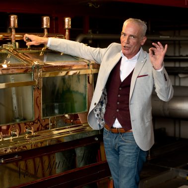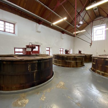 “Iedere distilleerderij heeft zijn eigen stijl. Wij blijven bij de traditionele stijl. Het is hier niet te koud en niet te warm. Het klimaat, het landschap, het water en het graan zijn de eigenschappen waarmee wij nog steeds om weten te gaan. Wij maken alleen single malt whisky’s, geen blends meer. Er is een stijgende lijn in de verkoop deze eeuw en veel distilleerderijen verdubbelen of verdrievoudigen de productie met allerlei blends. Ik vind dat gevaarlijk en zeg altijd: blijf bij je productierange. Tegenwoordig drinken de mensen minder, maar wel beter,” zegt hij met een grote glimlach. “Er is geen andere vloeistof dat je ‘soul’ raakt. Als je whisky drinkt en je krijgt kippenvel, dan is het pas een goede whisky.” We liepen naar buiten en om ons heen stonden de zwart geblakende opslaggebouwen. “Elke liter whisky die hier wordt gemaakt blijft ook hier.” Stewart wees naar de berg in de verte. “Wij hebben een eigen bron boven op de berg. Deze bron geeft ons het zachte water dat we nodig hebben.” We liepen door naar een geplaveid pleintje omringd door de oorspronkelijke gebouwen. “Zie je daar boven de roeken op het dak? Men zegt dat het The GlenDronach goed zal gaan zolang de vogels er blijven. Een van onze whisky’s heet ‘Parliament’, de Engelse benaming van een roekenkolonie.” We bezochten het Yeast house, Dry Malt House, Malt Mill House, Kiln Fire Room en de Mailings. Vervolgens liepen we de trap op naar de mash tuns. GlenDronach heeft een van de weinige ouderwetse gietijzeren rake-and-plough-modellen die nog bestaan. De 9 washbacks gemaakt van douglassparrenhout imponeerden door hun grootte en inhoud van 18.000 liter! De 4 gigantische koperen distilleerketels in saxofoonvorm in de aangrenzende ruimte straalden een heerlijk warmte uit. Stewart legde het hele proces uitvoerig uit en nam ons daarna mee naar de warehouses waar alle vaten opgeslagen waren om de whisky’s te laten rijpen. Minimaal 18 maanden verblijft de whisky in de sherryvaten, maar wij zagen ook een vat uit 1966 opgeslagen liggen.