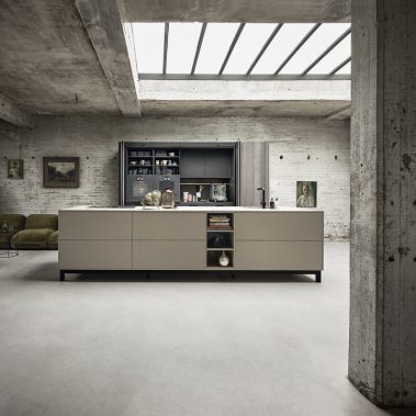 Hoe kunnen we in een keuken zoveel mogelijk opbergruimte creëren, zonder dat het huiselijke en ordelijke karakter verloren gaat? Dat kan met de nieuwe kast met dubbele inschuifbare kastdeuren. Deze kast, die op onzichtbare wijze multifunctioneel is, staat prachtig in elke keukeninrichting, zowel thuis als in een keukenblok op kantoor. Als de kastdeuren niet nodig zijn, schuiven ze gevouwen in de zijopening van de kast. De keukenkast kan bovendien geheel naar wens ingedeeld worden. Een blikvanger die met speels gemak alle ogen naar zich toe trekt: de sokkel van next125 met zijn sierlijke, licht naar buiten gebogen pootjes in elegant onyxzwart, is een designelement dat zijn effect niet mist. Het eiland op pootjes laat visueel comfort hand in hand gaan met alle mogelijke keukenactiviteiten – van bereiden, koken en spoelen tot opbergen. Het eiland is als het ware een soort ‘bühne’ voor een gezellig avondje koken en genieten.