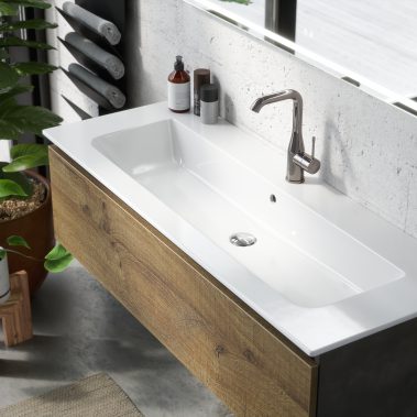 In combinatie met de imposante wastafelkasten van 65 cm. hoog in een houtstructuur of één van de vele andere corpus- en frontkleuren maakt dit design tot in de puntjes af. Vanzelfsprekend zijn er verschillende greep mogelijkheden om het meubel naar eigen smaak te complementeren. De mooie grafiete laden zijn voorzien van sluitdemping en evt. uit te voeren met Tipmatic voor het openen zonder gebruik te maken grepen of greepprofielen. Primabad levert standaard een ruimtebesparende sifon bij de wastafelbladen mee.