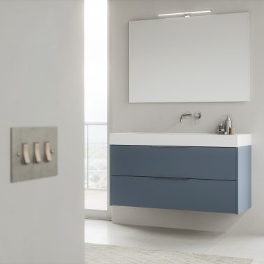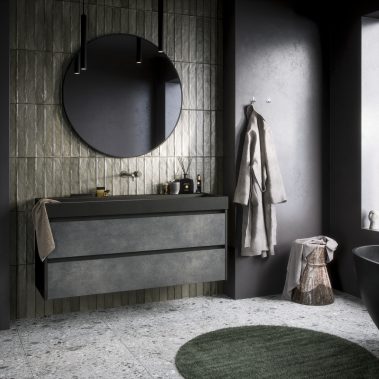 Het RISE-meubel van PRIMABAD is leverbaar in keramiek, beton en opbouwkommen. Er zijn 5 breedtematen (60,80,100,120 en 141 cm), 33 decor en 7 special corpus -en frontkleuren.