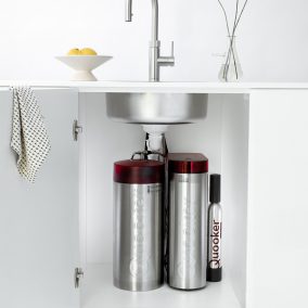 Wil je naast warm, koud en kokend, ook bruisend en gekoeld water uit je Quooker halen? Rust hem dan uit met een Quooker CUBE. Ook dat is een verantwoorde, duurzame keuze. Met een CUBE hoef je namelijk geen plastic flessen meer te kopen, die je vervolgens zou moeten koelen in de koelkast. In plaats daarvan maak je gebruik van een zeer zuinig gekoeldwaterreservoir onder in je keukenkast en herbruikbare koolzuurcilinders. Het door de gootsteen spoelen van oude spa rood, waar de prik uit is, behoort tot het verleden!