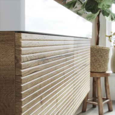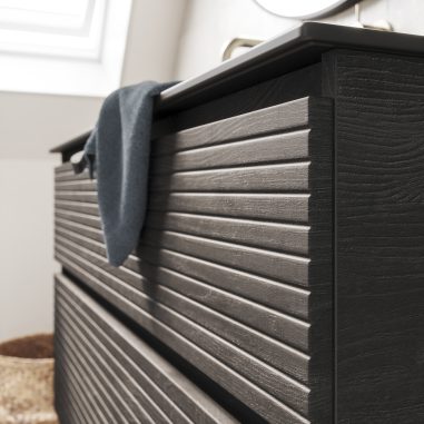 Het nieuwe Ribbelfront is voorzien van horizontale groeven waarmee een stijlvolle illusie van houten latten gerealiseerd wordt. Een meubel dat helemaal past in de huidige interieurtrend en dus perfect te combineren is met diverse interieurstijlen zoals hotel chique, japandi, botanisch of welke unieke stijl dan ook. Het nieuwe ribbelfront en een MDF foliefront( PEFC ) met achterzijde front in wit. Leverbaar in 3 kleuren die matchen met de kastcorpus kleur, maar uiteraard combineren met andere kleuren ook mogelijk: G17 Halifax Oak, G35 Smoked black, G59 Tabac oak.