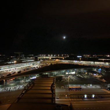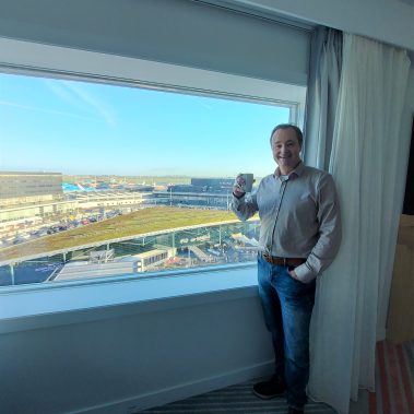 “Wij mogen een nachtje proefslapen en hebben genoten van de gastvrijheid. Dat begint al bij de overdekte en beveiligde parkeerplaats onder het hotel en naast de terminals. Op de 6e verdieping komen we in een Executive Suite van maar liefst 55 m2 met een ruime hal. Links ervan een grote woonkamer met flatscreen tv, bank, fauteuil en ronde eetkamertafel voor 4 personen. Een Nespresso-apparaat en koelkast maken het compleet. Twee grote ramen met fantastisch uitzicht op de aan- en vertrekhal van Schiphol met daarachter de landingsbanen met vliegtuigen. Rechts van de hal een grote badkamer en ruime slaapkamer met kingsize bed, flatscreen tv, zitje en natuurlijk weer een panoramisch uitzicht over de luchthaven. Hier gaan we niet meer weg!”