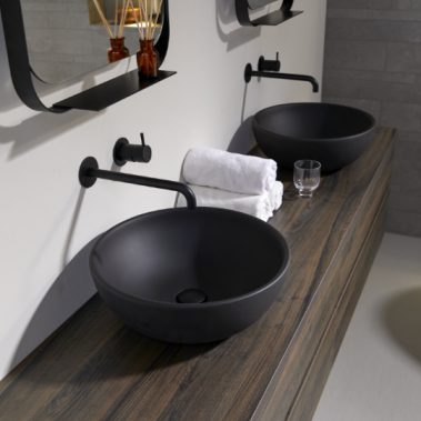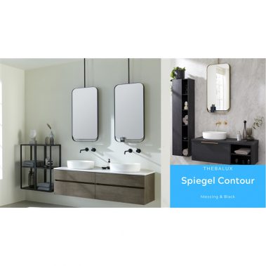 De ovale speelse badkamerspiegel Contour is er in zwart of messing met planchet en sierstang, waardoor het lijkt dat de spiegel aan het plafond hangt. De stalen spiegel is in zwart en messing/brons leverbaar. Het formaat is 50×100 cm. De badkamerspiegel Contour is goed te combineren met Serie Beat 2.0 / 40/45 cm diep.