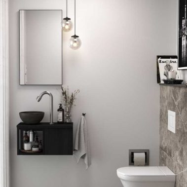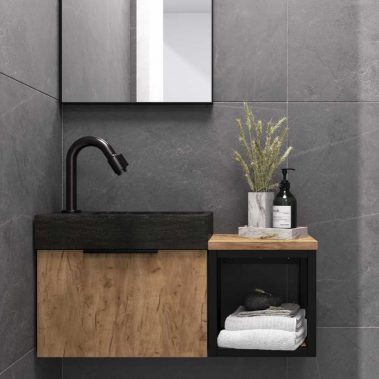 De mogelijkheden zijn eindeloos. Neem bijvoorbeeld de Glacier wastafel van Solid Surface in antraciet. Op een 395 mm frame met inleg in kleur Sherwood. De Vince kraan, design sifon en plug zijn hier in chroom. Naast de wastafel een muur handdoekhouder. Luxe spiegel in verdiept zwart kader en Globe lamp in verschillende lengtes. Of gaat u voor de opbouwkom van Basalt. Op een 250 mm frame en 250 mm onderkast in kleur Sherwood. Inleg en 400 mm topblad in kleur Sherwood. Met Vince wall kraan, design sifon en plug in Gunmetal. Naast de opbouwkom een muur handdoekhouder, luxe spiegel in verdiept zwart kader met Lucid lamp. Bijzonder is de Moon 23 opbouwkom van keramiek in mat zwart. Op een 250 mm frame met inleg en topblad in kleur Oak Grain. De Vince wall kraan, design sifon en plug in mat zwart. Naast de opbouwkom een muur handdoekhouder en luxe spiegel rond in zwart kader.